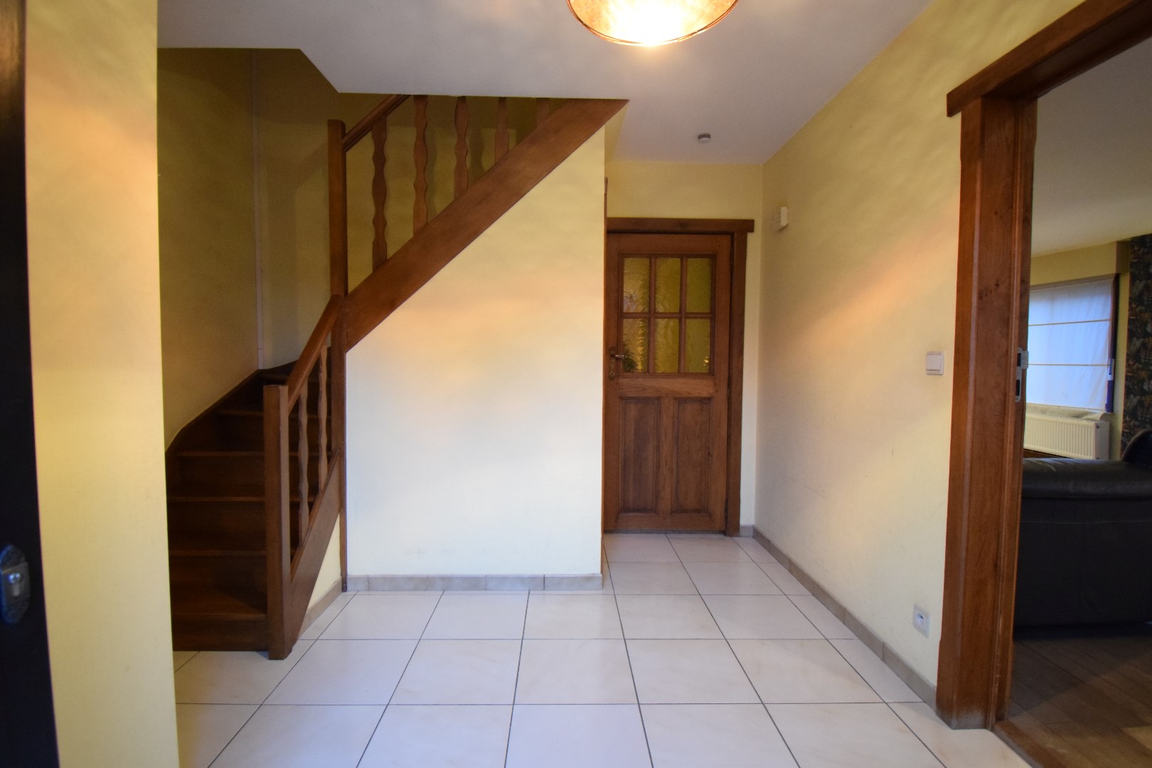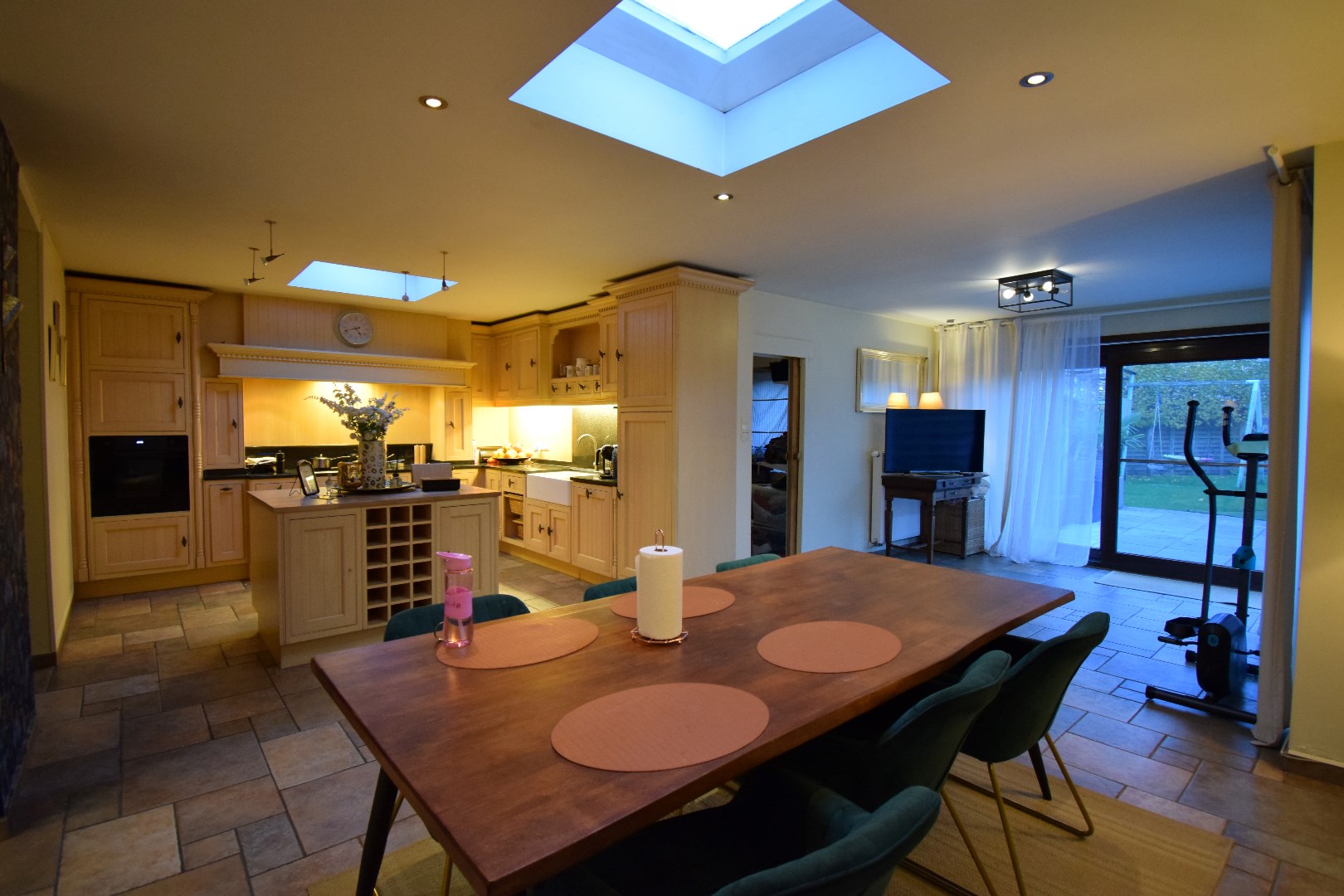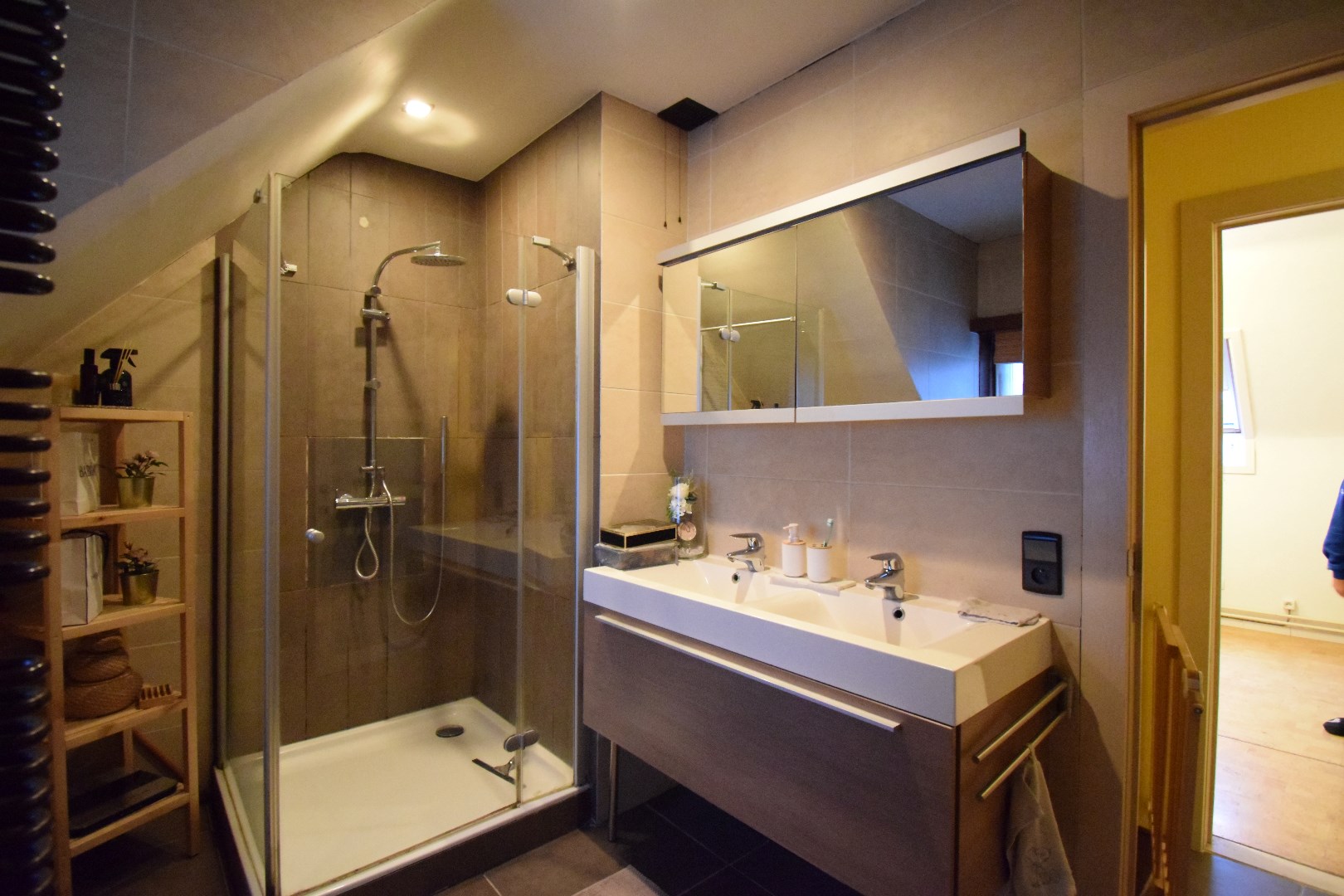 Indeling: inkom, gastentoilet, zeer ruime leefruimte met open keuken, bureau, achterinkom met douche. Op het verdiep bevinden zich 3 volwaardige slaapkamers en een badkamer.
