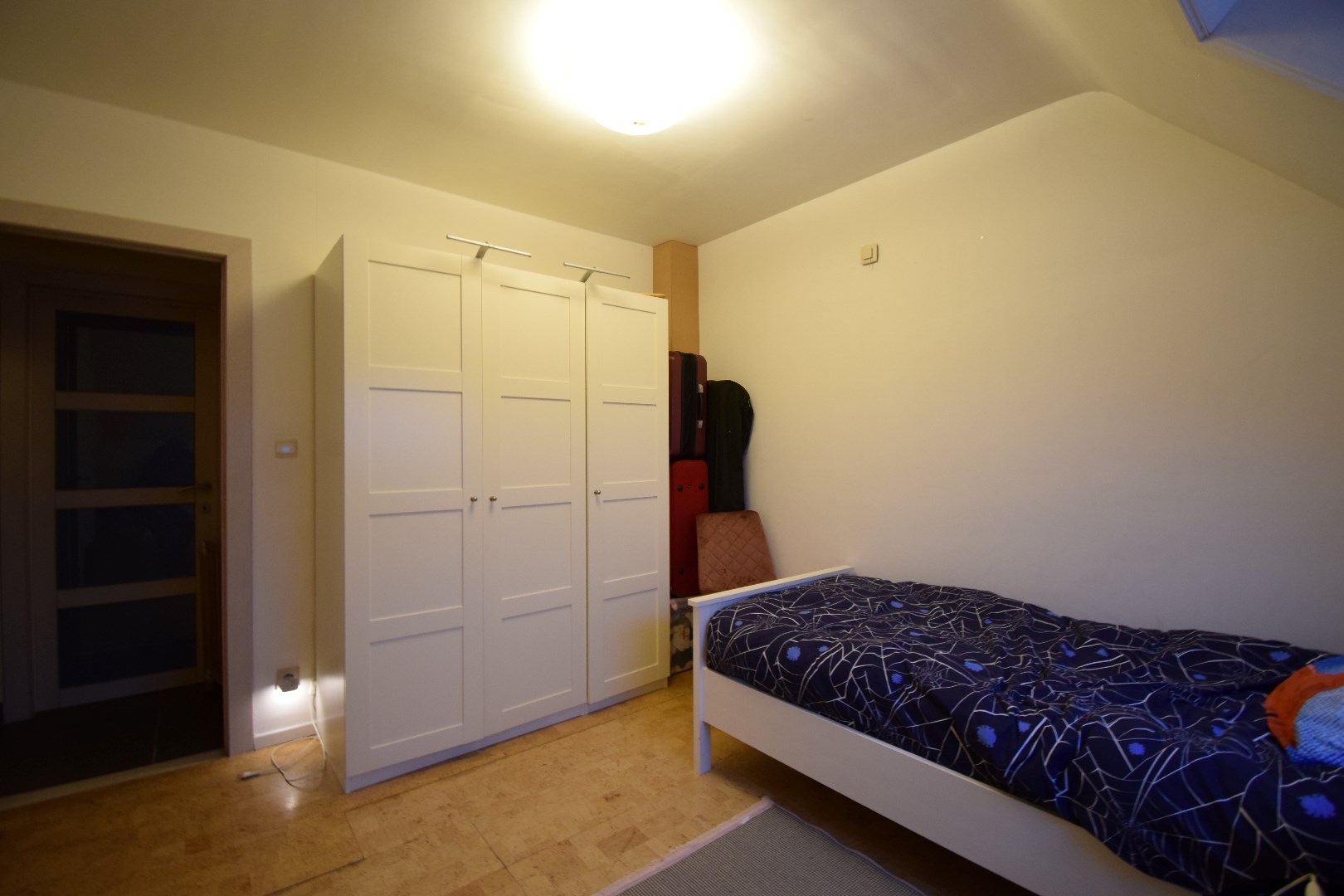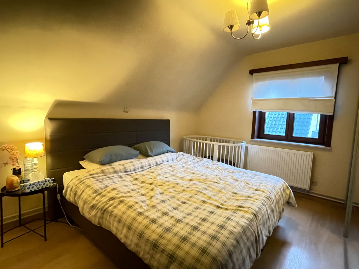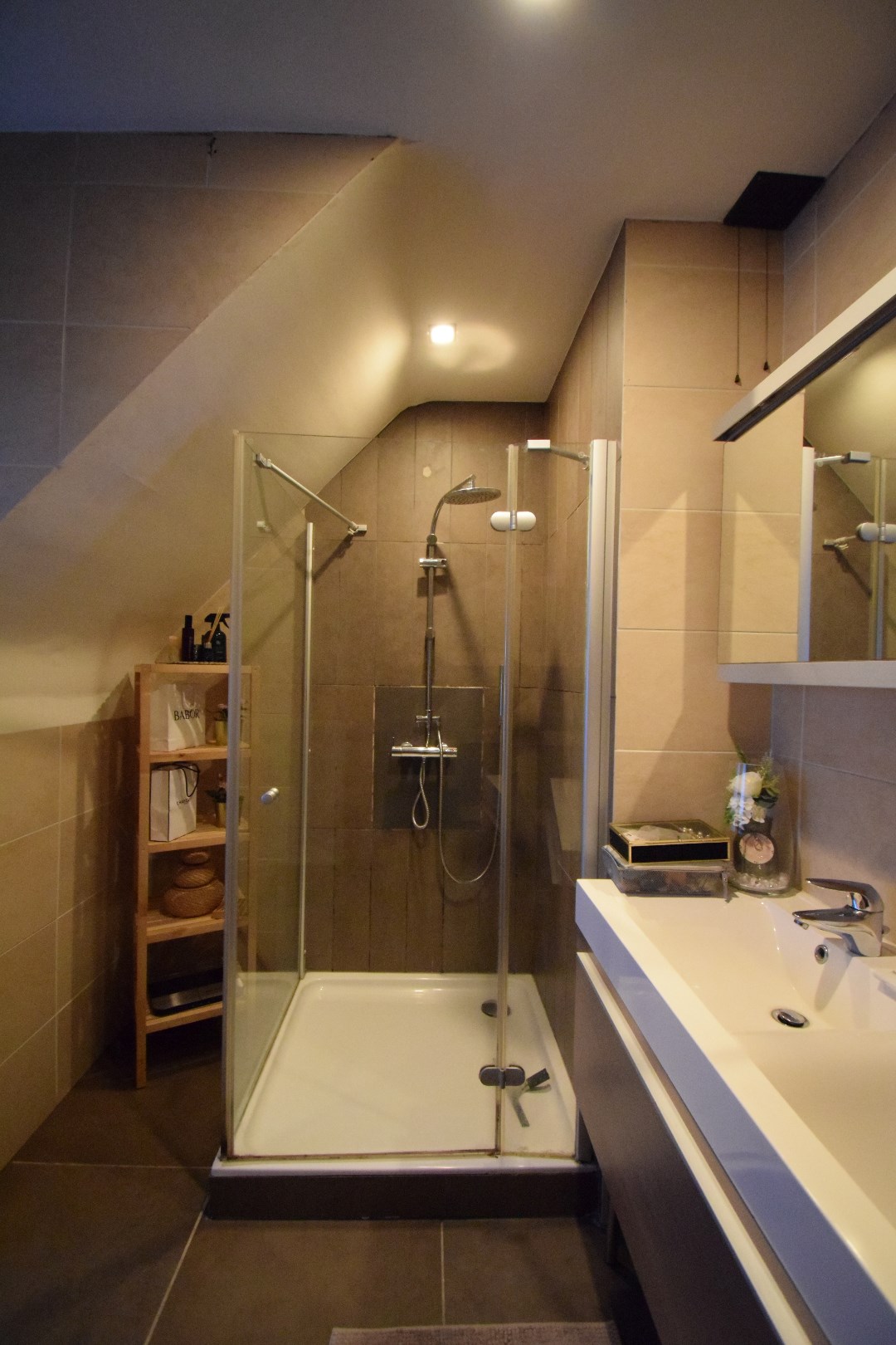Indeling: inkom, gastentoilet, zeer ruime leefruimte met open keuken, bureau, achterinkom met douche. Op het verdiep bevinden zich 3 volwaardige slaapkamers en een badkamer.