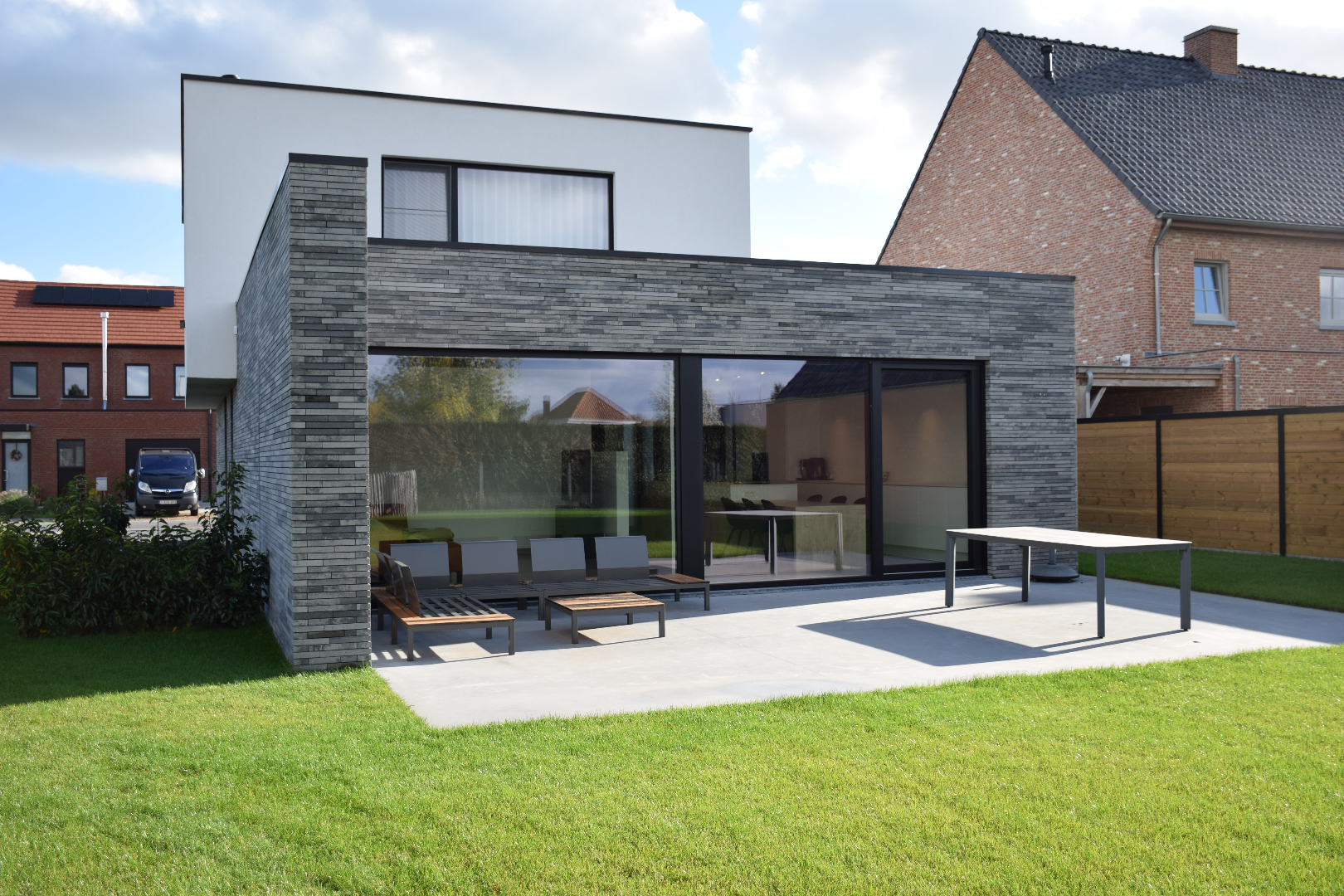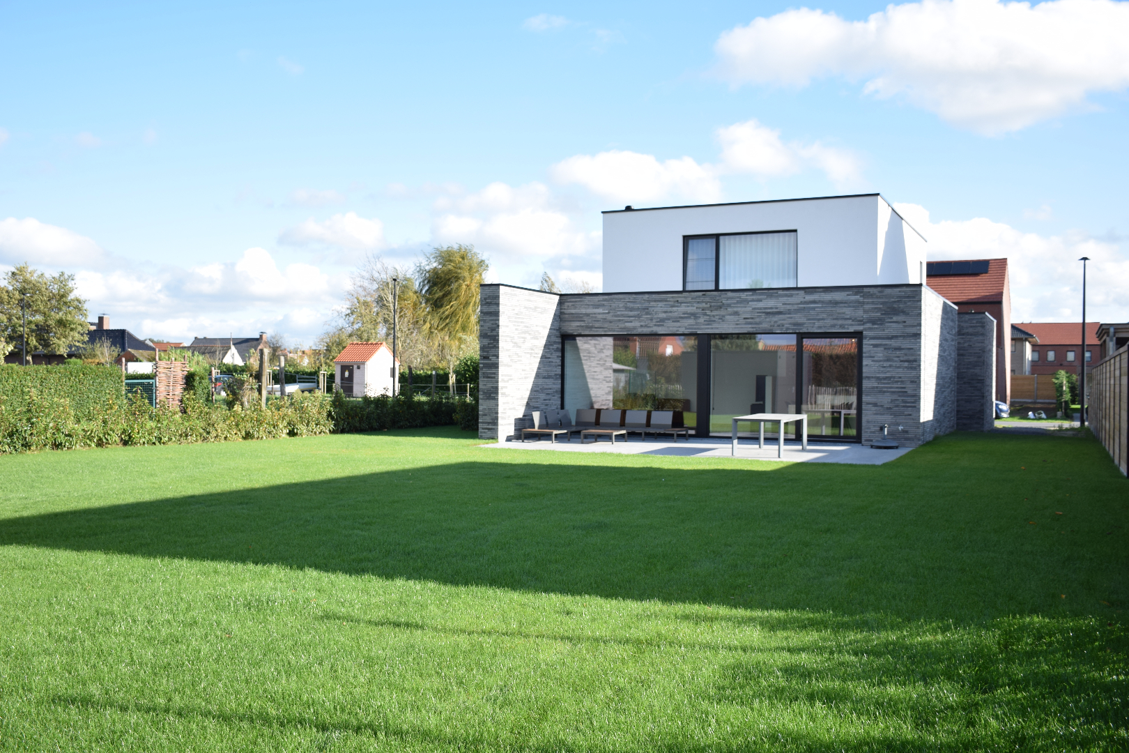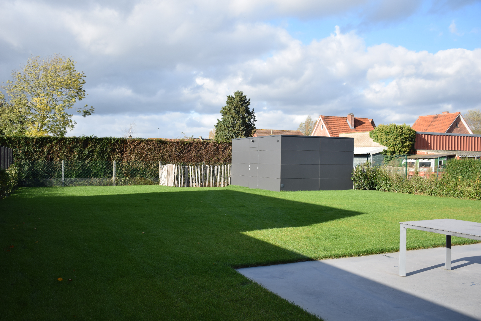 Het terras werd voorzien in een gepolierde betonplaat en de tuin werd volledig aangeplant, aangelegd én voorzien van een automatisch besproeiingssysteem. Er werd voorzien in een overdekte carport met automatische verlichting.