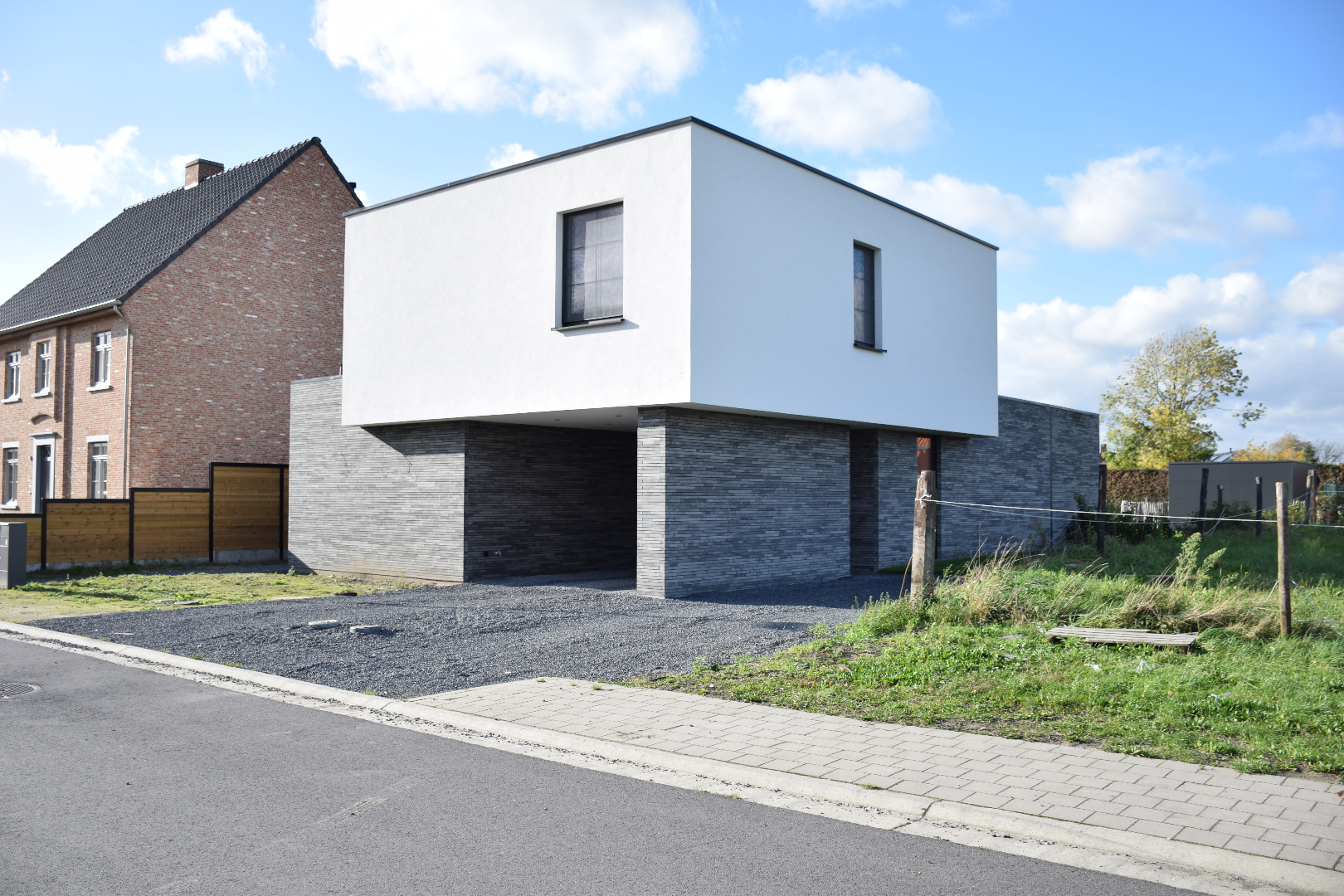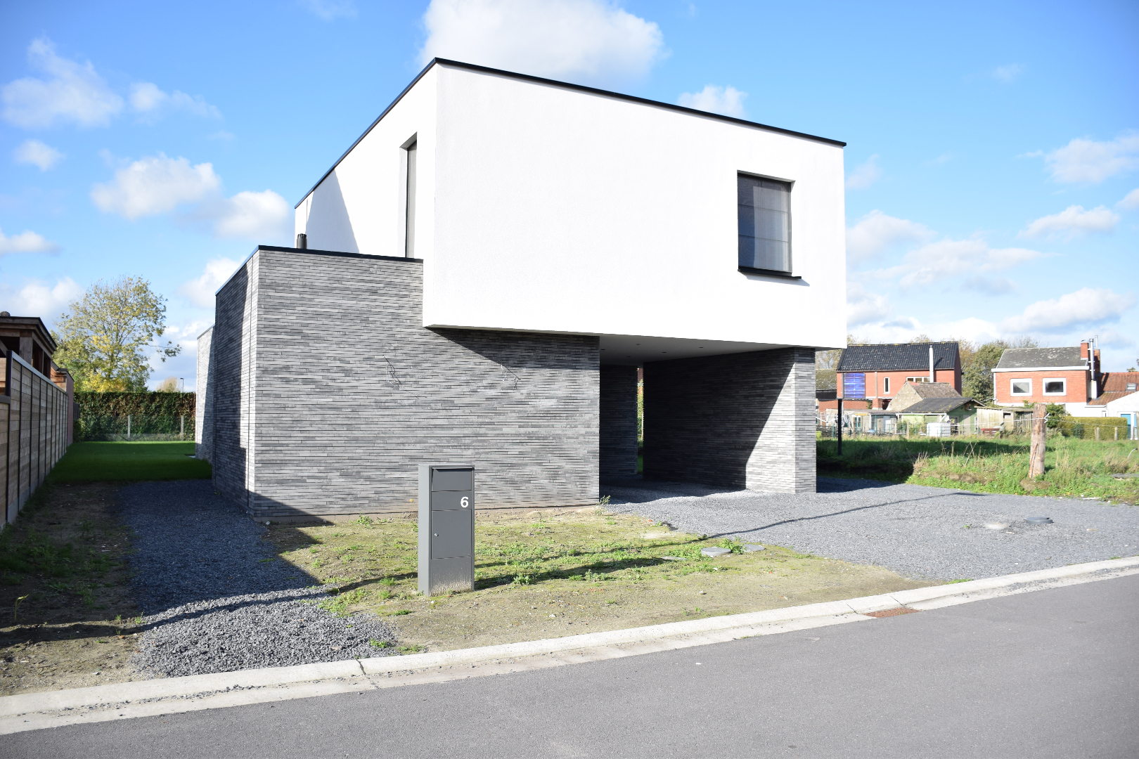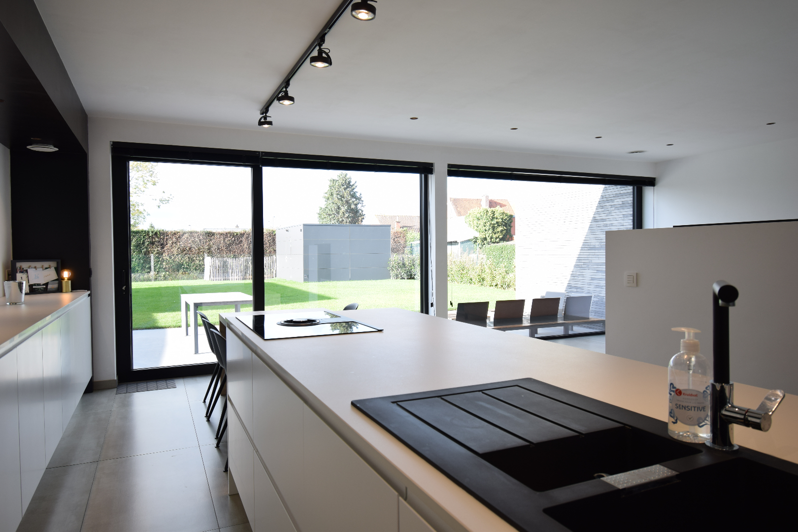 Het terras werd voorzien in een gepolierde betonplaat en de tuin werd volledig aangeplant, aangelegd én voorzien van een automatisch besproeiingssysteem. Er werd voorzien in een overdekte carport met automatische verlichting.