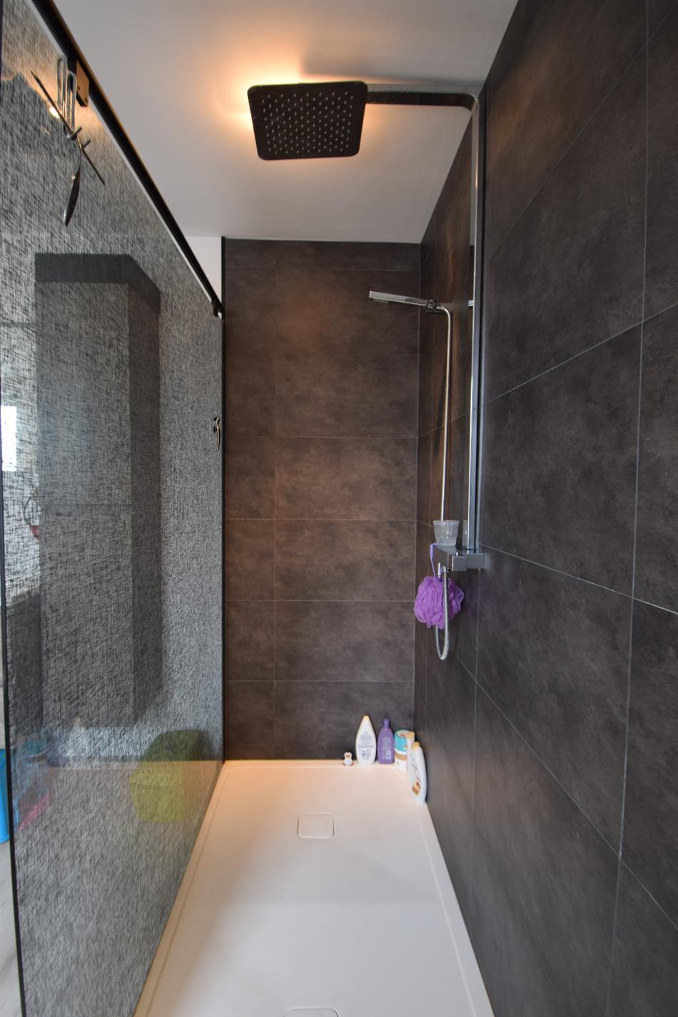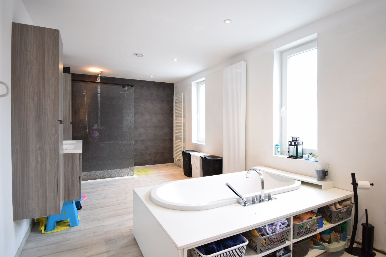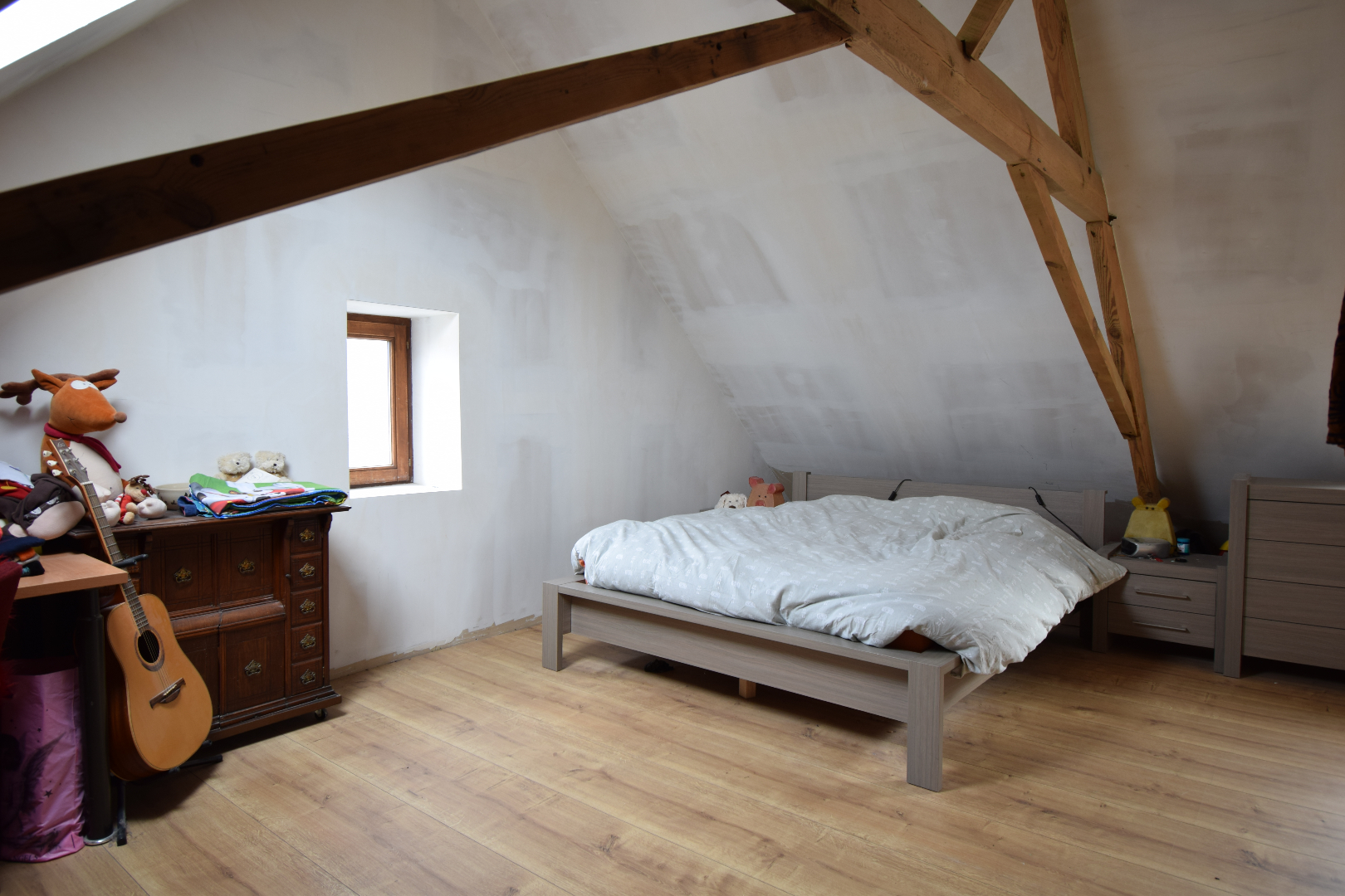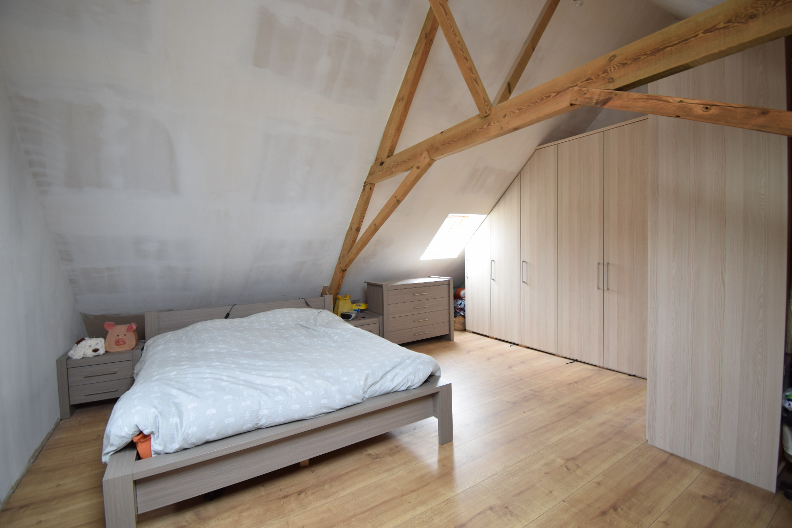 De eerste verdieping biedt plaats aan 3 ruime slaapkamers, apart toilet en bureauruimte. De zolder werd volledig omgebouwd tot masterbedroom waar de authentieke balken behouden zijn een heel mooi accent geven aan deze plaats!